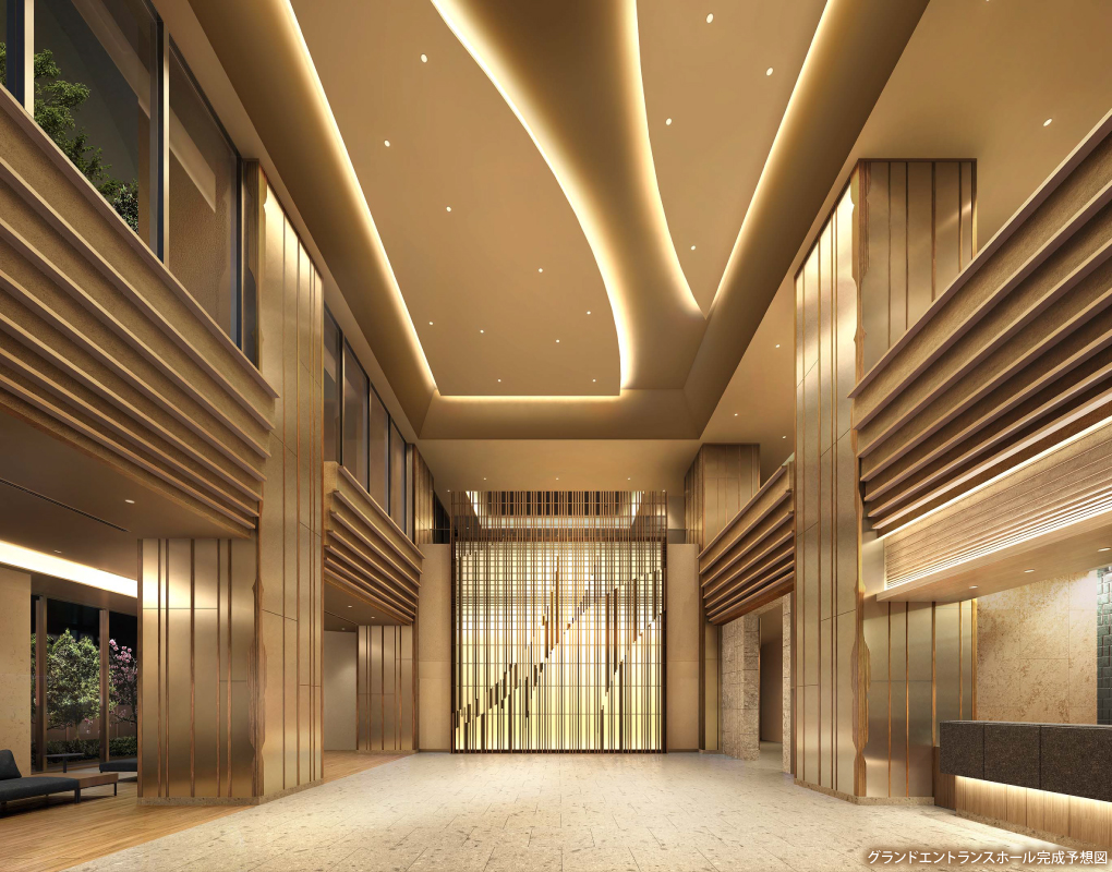 ※掲載の各完成予想図は、設計図書を基に描き起こしたもので形状・色等は実際とは多少異なる場合があります。なお外観形状の細部、設備機器は表現しておりません。表現されている植栽は竣工から初期の生成期間を経た状態のものを想定して書いており、竣工時は植物の成長を見込んで必要な間隔をとって植えています。設計・施工上の都合により設定位置・樹高・本数等が変更される場合があります。共用部の家具・調度品等は変更になる場合があります。