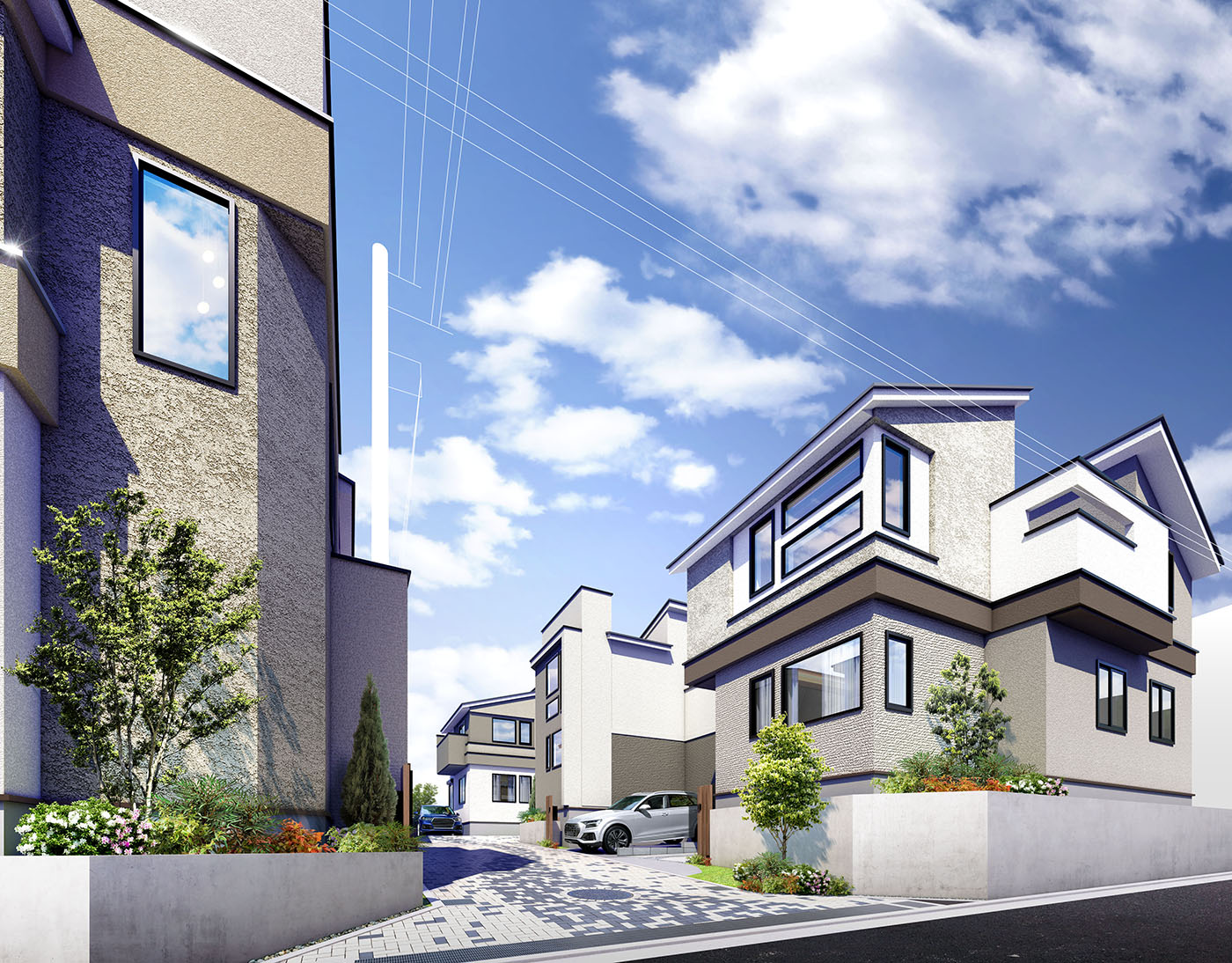 旧井草川の柔らかな水流をモチーフとしたインターロッキングの開発道路